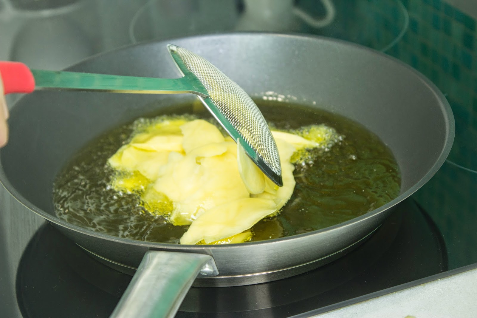 Luego pon en una sartén abundante aceite y cuando veas que está caliente echa las patatas a fuego medio. Si lo haces a fuego alto se freirán y no es lo que buscamos, por lo que mejor hacerlo despacito aunque tarde más.