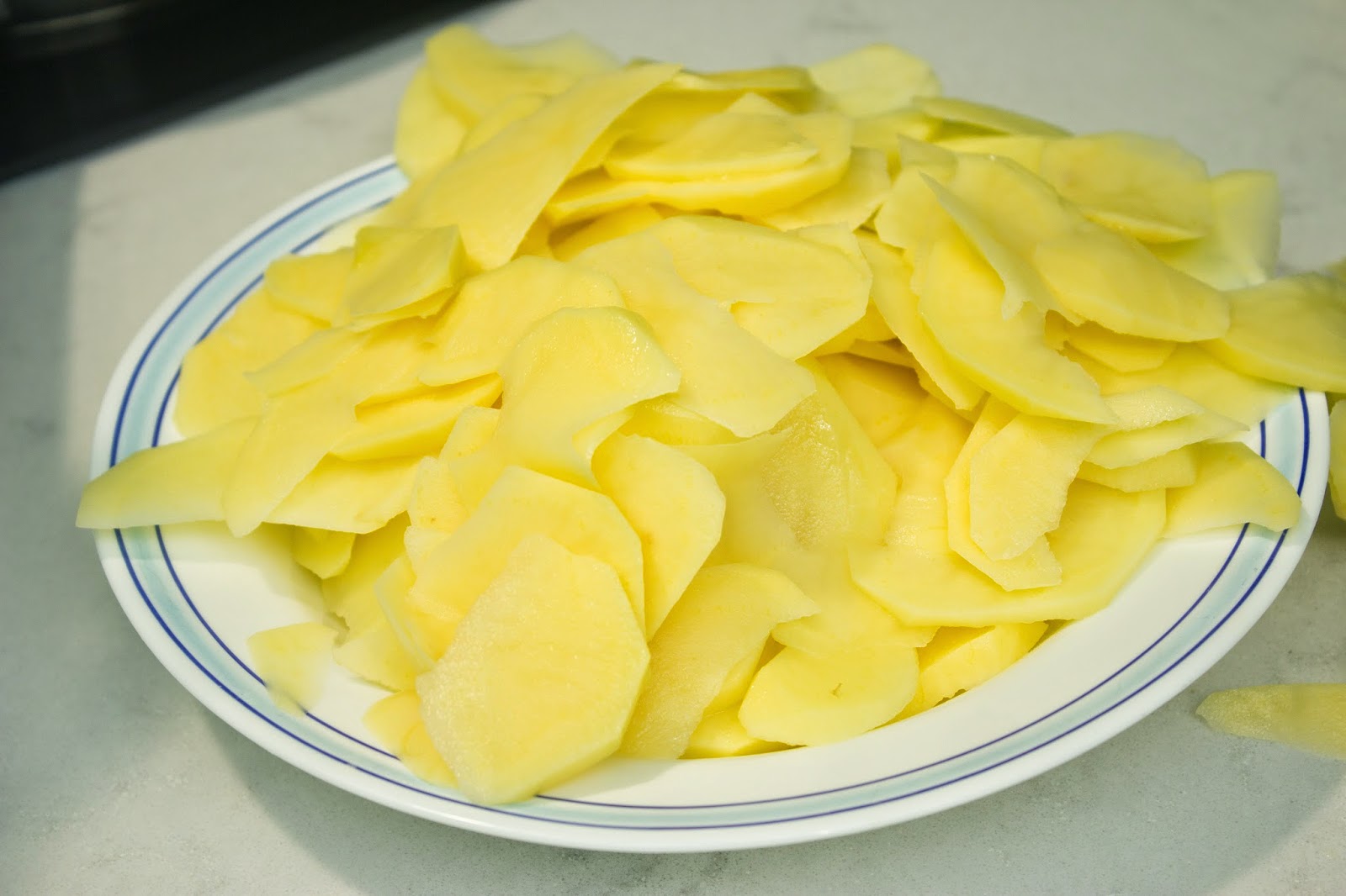 Ingredientes:5 patatas grandes6 huevos1/2 cebolla (opcional)abundante aceiteElaboración:En primer lugar lava las patatas, pélalas y corta las patatas en láminas finitas porque así se harán mucho mejor.