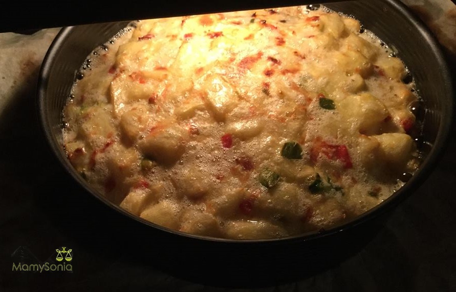 Pelamos las patatas, la cebolla y cortamos, también los pimientos en dados medianos, salamos y freímos en abundante aceite. No hace falta que se frían del todo, con que nos queden pochas es decir medio cocidas, de este modo nos quedará la tortilla más jugosa. Escurrimos y reservamos.