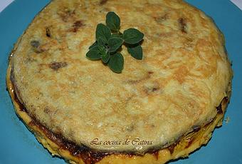 Encima ponemos la tortilla de patatas anterior y dejamos un minuto. Volteamos cuando esté doradita y servimos enseguida.