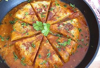 ** La tortilla cuajarla en una sartén tirando a pequeña, así os quedará más alta y también a la hora de ponerla dentro de la salsa no necesitaréis una gran cazuela o sartén.