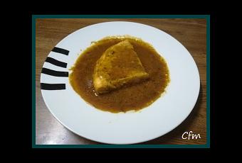 -Pochamos a fuego lento en un sartén el ajo y la cebolla con el aceite y un poco de sal-Agregamos la cucharada de harina y las hebras de azafrán y seguimos hasta que la harina esté cocinada- Incorporamos el caldo y cocemos a fuego lento durante unos 10 minutos-Añadimos la tortilla a la salsa y cocinamos unos 10 minutos mas-Espolvoreamos perejil picado porencima