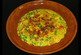 Ingredientes:- 3 huevos.- 2 patatas.- ½ cebolla.- 50 gramos de guisantes.- ½ pimiento rojo.- Aceite de oliva virgen extra.- Sal.Elaboración:La verdad es que los ingredientes que lleva esta tortilla son libres, podéis cambiar alguno si no os gustan por espárragos trigueros, jamón o chorizo. Para rebajar un poco el número de calorías he utilizado un pimiento asado y he cocinado al microondas las patatas y la cebolla.Cortamos la patata para tortilla y la cebolla en cachos pequeños y lo metemos al microondas con un chorro de aceite durante 5 minutos a máxima potencia. Sacáis le dais un par de vueltas y lo metéis durante 7 minutos. Cocéis los guisantes y echáis todos los ingredientes a los huevos batidos.Colocáis en el fuego una sartén con un poco de aceite y añadís la mezcla dejáis que se haga por un lado y luego le dais la vuelta y ya está lista para comer.