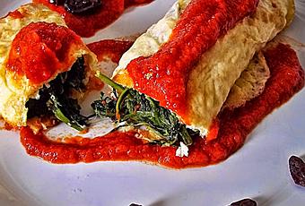 * Primero vamos a hacer la salsa de tomate, para ello volcamos en una olla el tomate, le añadimos una pizca de sal y dos cucharadas de aceite de oliva.* Lo dejamos a fuego medio, moviendo de vez en cuando, hasta que tenga la consistencia deseada.* He utilizado espinacas congeladas, he seguido los pasos del embase y he escurrido muy bien el líquido. Después las he recortado un poco con las tijeras, pues me parecían muy grandes las hojas para el relleno.