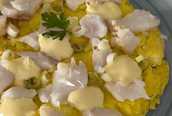 Batimos los huevos cuajamos la tortilla. Servimos con el bacalao en lascas, la cebolleta y la piparra en daditos y puntos de mayonesa.
