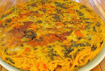 - Calentamos la sartén con un poco de aceite de oliva. Vertemos la mezcla en la sartén distribuyéndola de forma homogénea. Cuando esté dorada por un lado le damos la vuelta con la ayuda de un plato y cocinamos por el otro lado otros 5 minutos.