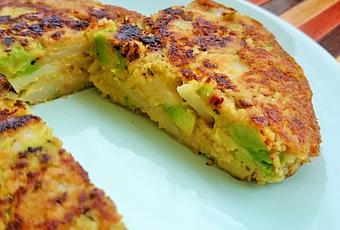 - Mezclamos bien las patatas, el aguacate y la cebolla con los garbanzos. Engrasamos una sartén con un poco de aceite y vertemos la masa. Agitamos la sartén de vez en cuando para que no se pegue la tortilla. Después de unos minutos le damos la vuelta con la ayuda de un plato y la cocinamos por el otro lado. Le damos varias vueltas para que quede mejor hecha por dentro. Dejamos reposar la tortilla unos 10-15 minutos para que no se deshaga.