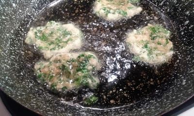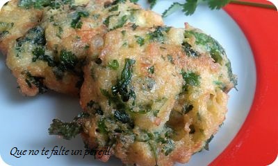 Mientras reposa un poco, vamos calentando abundante aceite de oliva para freír las tortillitas. Cuando esté caliente, ve poniendo cucharadas de esta masa. Cuando se hagan por un lado , dales la vuelta.