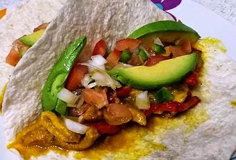 Pelamos el aguacate y lo cortamos en tiras. Metemos 30seg las tortillas de trigo en el micro. Y montamos nuestras tortillas rellenas de pollo y aguacate. Ponemos el pollo con el sofrito de cebolla y pimientos, encima ponemos lo que teníamos en el bol aliñado y encima los trozos de aguacates. Cerramos la tortilla y a comer...