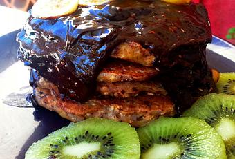 - Servimos las tortitas con la salsa de chocolate y fruta.