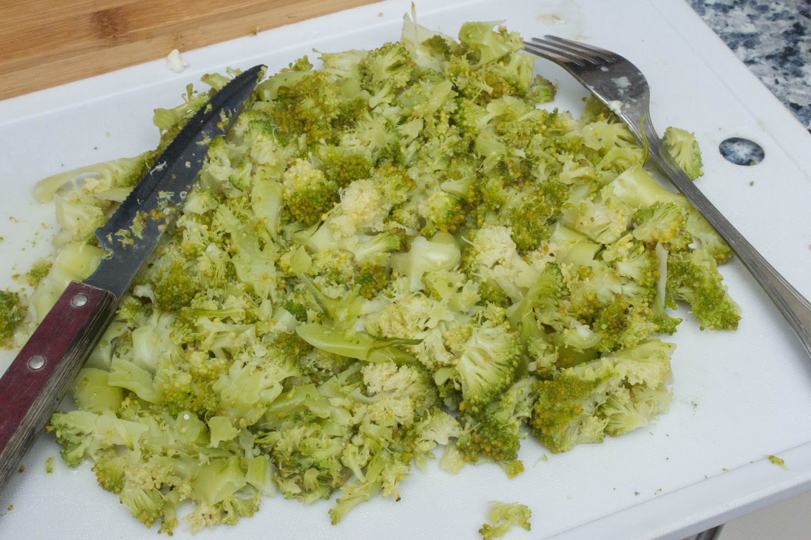 Luego coger las ramas y ponerlas en una tabla de cortar. con un cuchillo y tenedor cortar en trocitos.