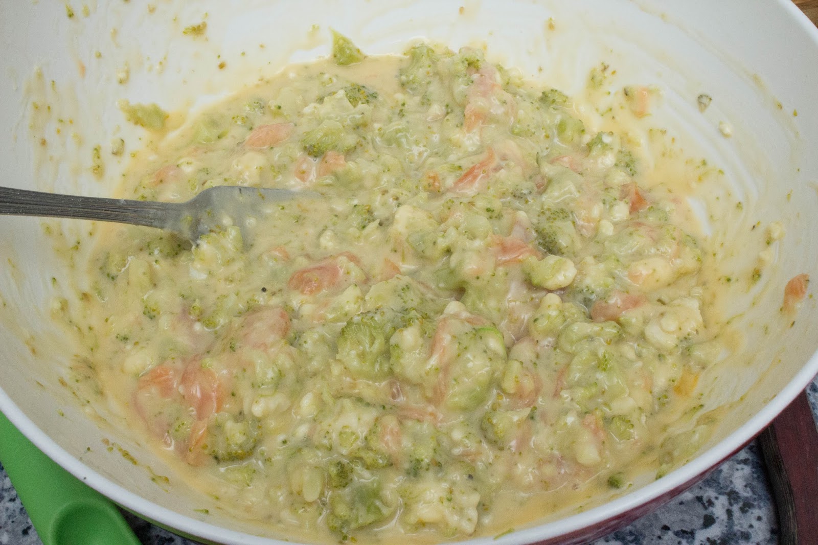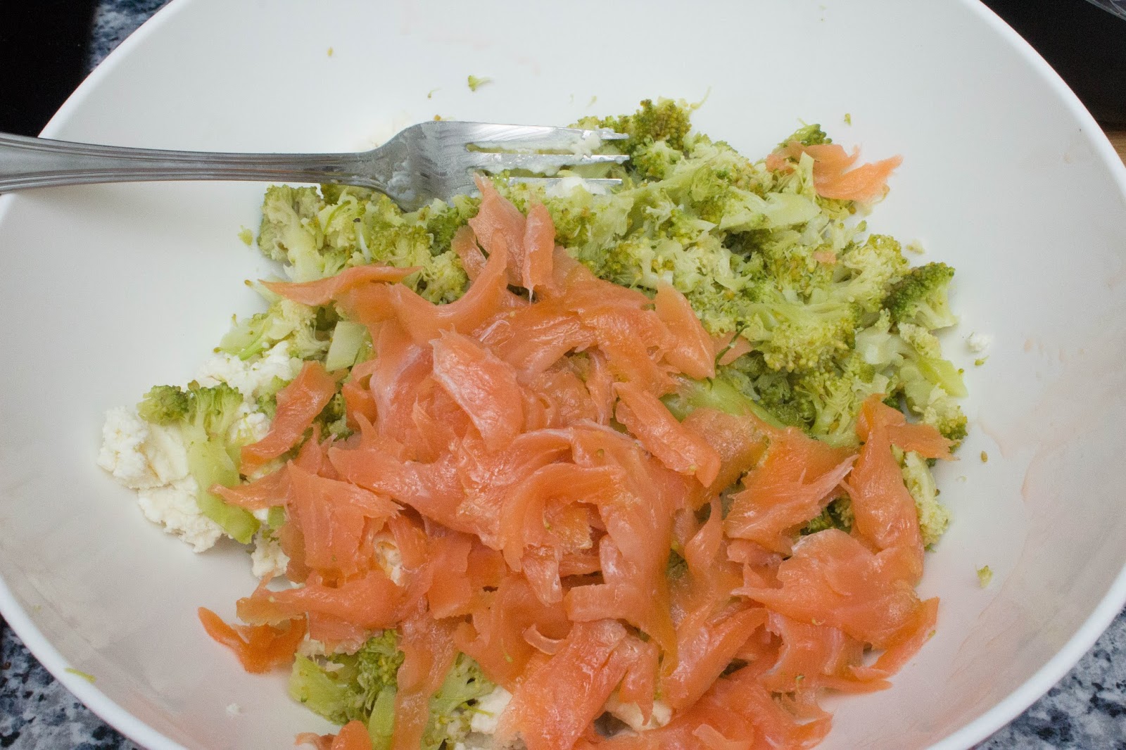 Ingredientes:1 brócoli1 queso de cabra de barra1 sobre de salmón ahumado2 huevos50 gr de harina o hasta que quede una masa mojada