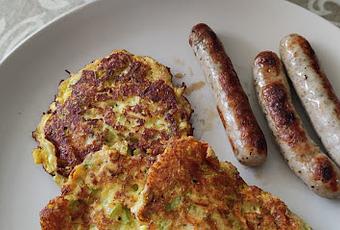 Aprovechando que mi hija me ha regalado unos calabacines, he preparado estas tortitas para comer hoy, las hemos acompañado con unas salchichas alemanas especiadas y una salsa de yogur.