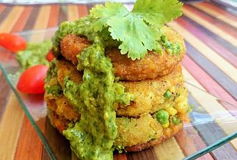 ♥ 6-7 patatas♥ 2/3 vaso de guisantes (descongelados)♥ 4-5 cdas de pan rallado (opcional)♥ 1-2 cdas de margarina vegetal♥ 2 cdtas de curry en polvo♥ 1/4 cdta de cardamomo♥ pimienta♥ salPara la salsa verde:♥ 1 manojo de cilantro♥ 1/2 aguacate (opcional)♥ 3 dientes de ajo♥ zumo de 1 lima (o 1/2 limón)♥ 1 cda de sirope de agave♥ 1-2 cdas de agua