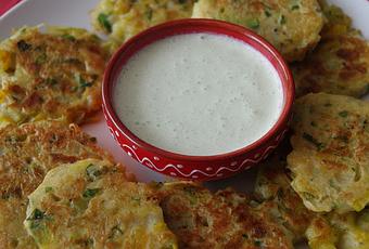 En una sartén poner dos cucharadas de aceite a calentar. Con una cuchara coger porciones de la masa de puerros y formar tortitas redondas que dejaremos dorar a fuego suave durante unos 5 minutos por cada lado. Servir calientes acompañadas con la salsa de yogur y albahaca.