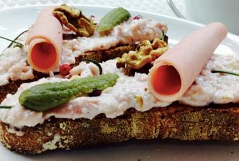 INGREDIENTES (para 2 tostas): 2 rebanadas de pan, 150 g de mortadela lunch, 2 cucharadas de crema de queso (tipo philadelphia), 15 g de frutos secos (nueces, pistachos, anacardos ... etc), 2 pepinillos en vinagre, 1 toque de pimienta, 4 granos de pimienta rosa (se puede cambiar por la pimienta que tengáis)