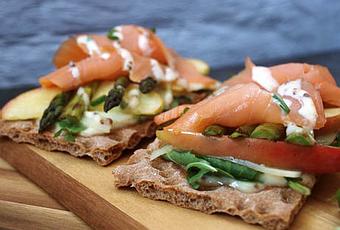 Para el montaje, sobre una tosta untamos un poco de la salsa, después ponemos rúcula, media loncha de queso y 3 gajos de manzana, después trigueros, unos 4 y terminamos con unas lonchas de salmón, adornamos con un poco mas de salsa y cebollino picado