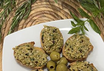 Un bote de aceitunas verdes sin hueso (aprox. 200 gr.)una guindilla fresca (retirar pedúnculo y semillas)dos o tres tallos de albahaca fresca30 gr. de piñones 30 gr. de aceite de olivarodajas de pan tostadas