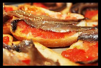 Lo primero que vamos hacer es limpiar las anchoas, primero quitamos la cabeza y después las tripas. Quitamos las espinas del centro y las pequeñas de los lados. Después, metemos 45 minutos los filetes de la anchoa en agua para desalarlos.Cuando pase los 45 minutos, ponemos las anchoas en un papel de cocina para absorber el agua. A continuación cogemos un recipiente, echamos aceite de oliva en gran cantidad y metemos los filetes de anchoas, deben de quedar todos cubiertos. Lo dejamos unas 12 horas en aceite de oliva.Ahora cogemos los tomates, los rallamos y lo reservamos. Tostamos el pan, ponemos el tomate, los filetes de anchoas y echamos aceite de oliva por encima.