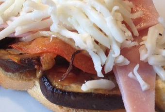 Calentamos el horno a 200º para gratinar. Cortamos el pan en diagonal para hacer las rebanadas más grandes.Calentamos una plancha o sartén y tostamos el pan. Pasamos por la plancha los vegetales para que se hagan un poco y salamos. Los colocamos de la siguiente forma: una capa de berenjena, el tomate, la cebolla, el jamón troceado y el queso repartido por encima. Gratinamos apenas cinco minutos y servimos caliente.