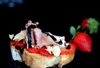Tuesta el pan en el horno con un chorrín de AOVE. Lava y corta la fresa en láminas muy finas. Coloca sobre la tosta de pan. Incorpora el bonito y después el jamón, salsea con la reducción ayudandote de una cucharita.