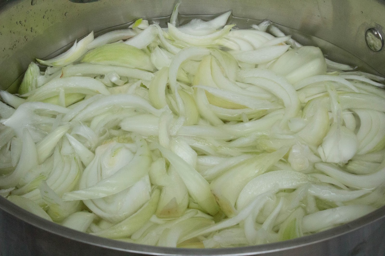 Lo siguiente es poner las cebollas en la cazuela y luego echas agua hasta que pase un dedo la cebolla.