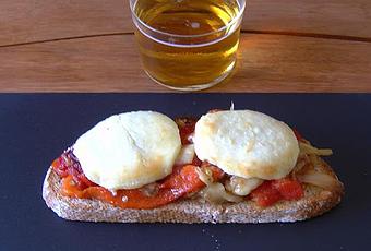 Tostamos el pan. Cubrimos las tostas con la escalibada y por encima el queso de cabra.
