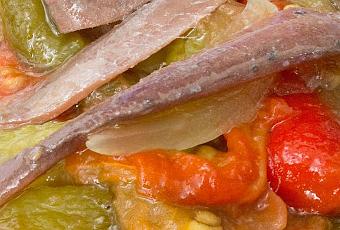 Ingredientes:2 pimientos verdes2 pimientos rojo1 cebolla3 dientes de ajo1 berenjena3 tomatesun poco de aceiteanchoasrebanadas de pan de espeltatumaca (3 tomates, 2 dientes de ajo, chorrito de aceite)