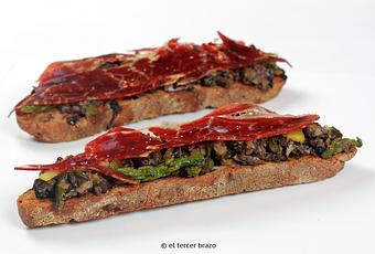 6.- Servimos ayudándonos de una cuchara sobre una rebanada de pan tostado y para coronar la tosta, dejamos caer sobre el salteado una loncha de www.jamonprive.com.