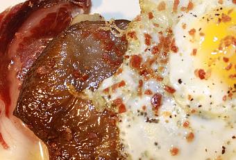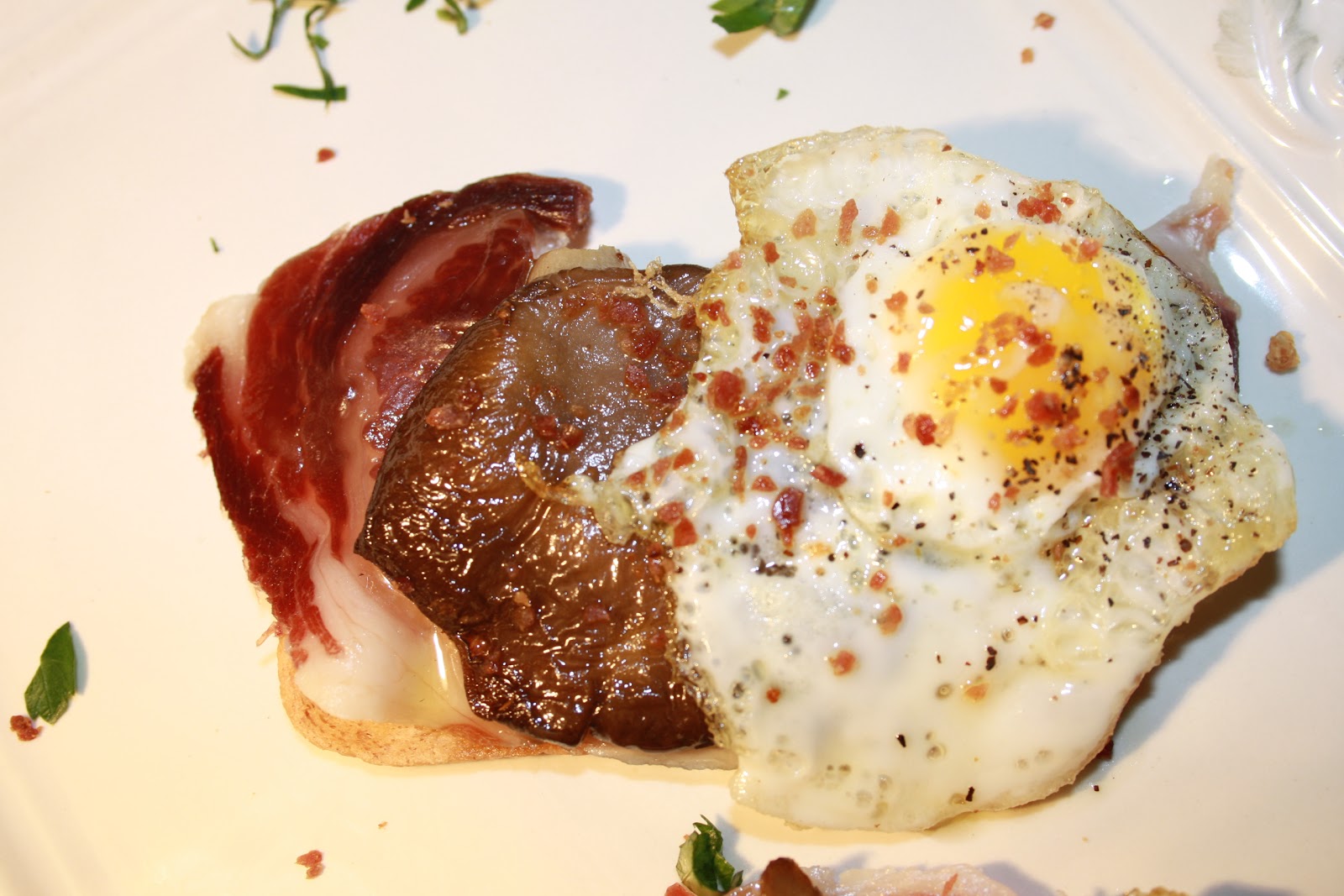 Poner en el pan primero la loncha de jamón, después la seta y a continuación el huevo de codorníz.