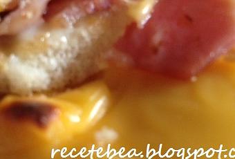 Calentamos el horno a 200º para gratinar. Cortamos el pan en diagonal para hacer las rebanadas más grandes.Calentamos una plancha o sartén y tostamos el pan.. Los colocamos de la siguiente forma: loncha de queso, lonchas de bacon, loncha de jamon y el queso cheddar. Gratinamos apenas cinco minutos y servimos caliente.