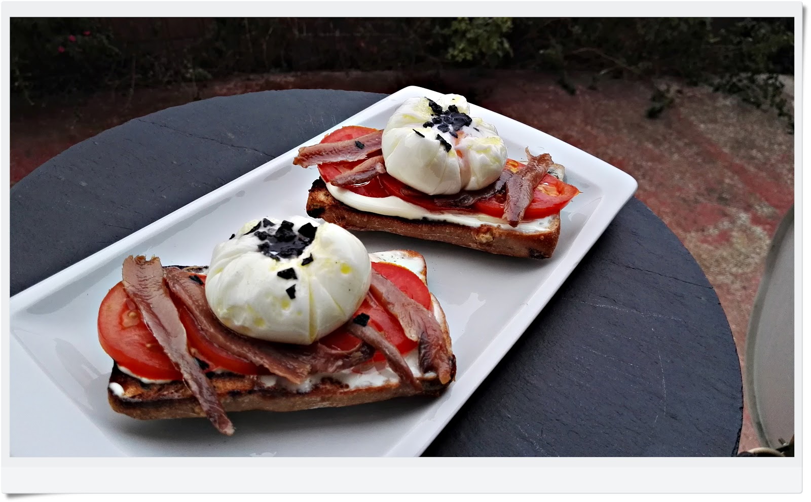 Untamos nuestros panes con crema de queso, le ponemos un chorrito de miel a cada una y encima el tomate, colocamos las anchoas y por ultimo con mucho cuidado los huevos poche, el huevo tiene que estar bien por fuera y la yema entera, para cuando lo cortemos toda nuestra tostada se llene de yema, para rematar la tapa le ponemos un poco de sal de escama negra o la que tengamos.