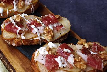 Para montar las tostas, untamos con queso crema una capa que cubra el pan y añadimos crema de roquefort, cubrimos con una capa de pera, después repartimos el jamón y las nueces. Hacemos unos hilillos con la miel y unas tiras con la crema de queso roquefort, espolvoreamos albahaca y listo.