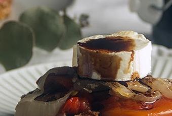 3. Cortamos el pan en rebanadas y lo tostamos. Sobre ellas colocamos el foie untado, los pimientos salpimentados y mezclados con las cebollas y un chorrito de aceite Coronamos con el queso de cabra cortado en redondo.