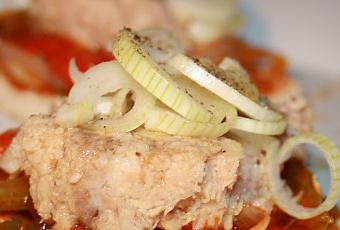 En una sartén con aceite echamos la cebolla cortada en juliana, osea en tiras, cuando ya esté blandita, añadimos el pimiento verde, después el rojo cortado en tiras y por último 4 cucharadas de salsa de tomate. Dejamos 5 min y retiramos.