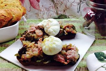 INGREDIENTES (para 2 tostas): 2 rebanadas de pan, 4 salchichas, 100 g de setas, 1 cebolleta, 1/4 de pimiento verde, 1 diente de ajo, 3 cucharadas de aceite, 2 huevos, 1 cucharada de mostaza, 1 toque de pimienta, 1 chorrrito de vino blanco y sal.