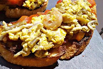 Una vez puesta la base ponemos el revuelto por encima y colocamos sobre una bandeja o en platos, el mío es de la vajilla de porcelana de la fábrica Porvasal en Valencia.