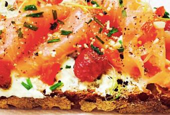 Tosta de salmón con rabanitos al horno sobre crema de queso, pimiento rojo y cebollino