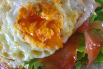 Elaboración:Cortamos la chapata a lo largo y horneamos a fuego alto unos minutos. Cuando esté crujiente la sacamos, cubrimos con los tomates cortado en rodajas muy finas y rociamos con un poco de aceite. Volvemos a hornear unos 3 minutos más y dejamos que enfríe mientras vamos preparando el resto de ingredientes.Freímos los huevos por las dos caras (dejando la yema sin hacer demasiado) y retiramos a un plato.Cortamos la lechuga en tiras finas que iremos colocando sobre el tomate cuando esté templado, y salseamos ligeramente.