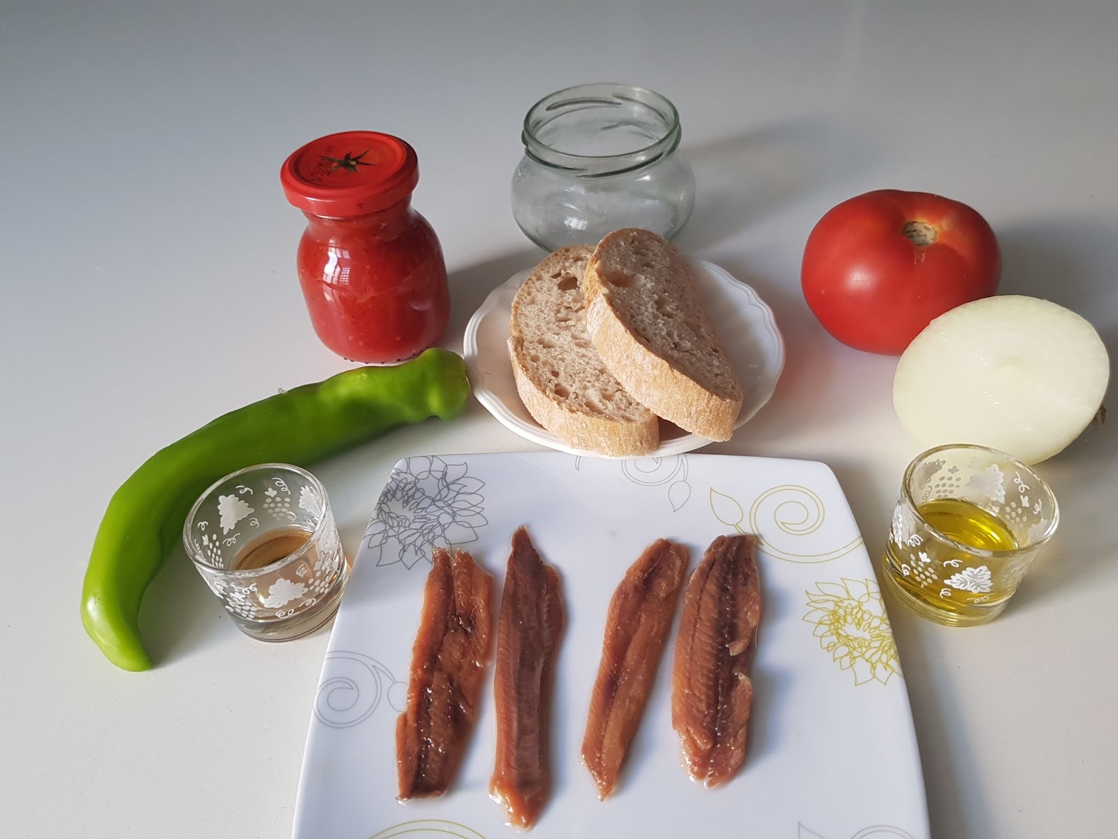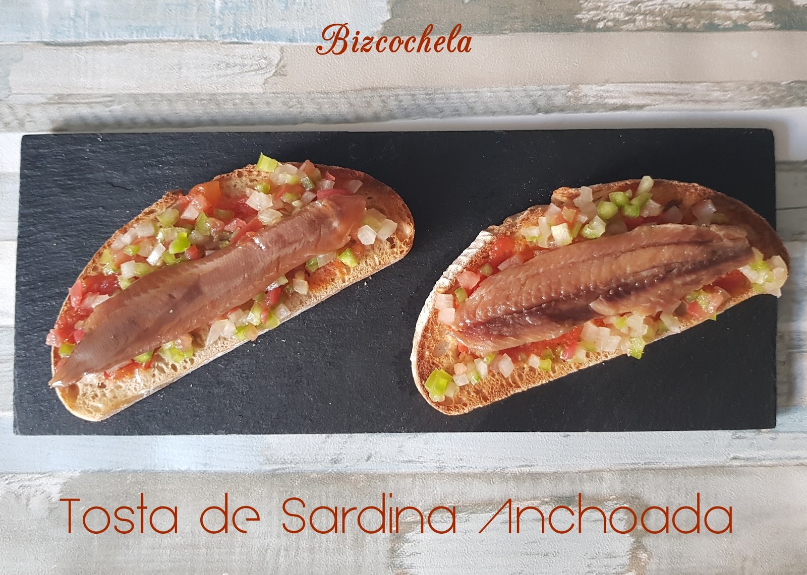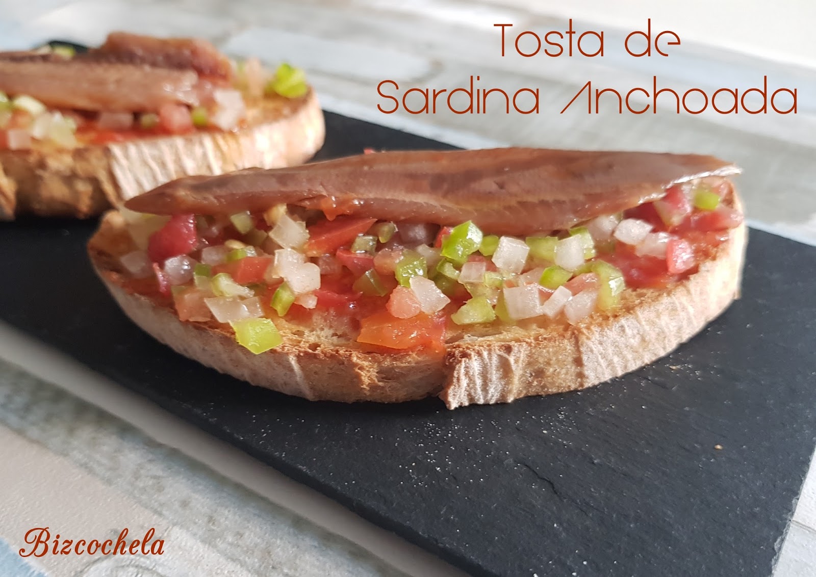Rebanadas de pan Sardinas anchoadas Tomate Pimiento Cebolla aceite,vinagre y sal