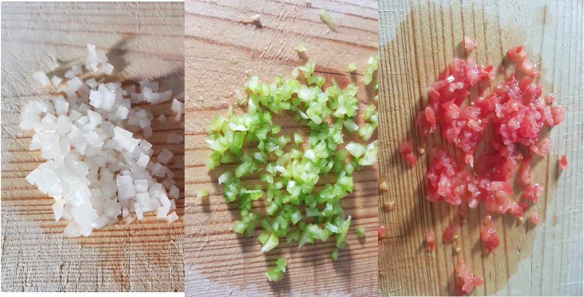 1. - Lo primero que haremos será ponernos a picar muy muy muy fino la cebolla, el pimiento y el tomate.