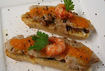 PREPARACIÓNEn una sartén con un poco de aceite rehogamos las cebolletas cortadas a tiras a fuego muy suave. Cuando la tengamos bien pochada, la retiramos y reservamos.En la misma sartén, a fuego más fuerte, ponemos los filetes de ventresca. Los hacemos, por cada lado, durante 1-2 minutos.Cortamos y pelamos los tomates y los dientes de ajo. Los ponemos en la batidora con un poco de sal y un buen chorro de Aceite de Oliva Virgen Extra. Trituramos hasta emulsionar.Montamos la tosta poniendo en la base un poco de cebolla, encima la ventresca y luego un poco de la emulsión de tomate.Como había hecho también unas gambas al ajillo, distraje cuatro y coroné la tosta con ellas.