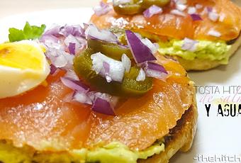 Cubrimos con una buena capa de guacamole y sobre ella disponemos las lonchas de salmón ahumado. Colocamos una rodaja de huevo - con una pizca de sal -, los jalapeños - al gusto - y espolvoreamos con la cebolla morada picada.