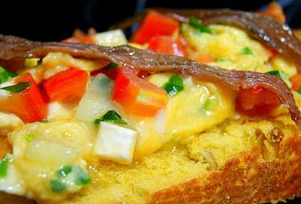 Colocamos el revuelto sobre la tosta y le ponemos dos anchoas en salazón.Servimos.