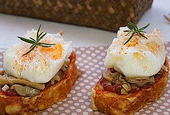 Ingredientes:- 4 lonchas de pan de tres quesos.- 2 dientes de ajo.- 80 grms de setas de cultivo o champiñones.- 60 grms de sobrasada.- 4 huevos pequeños.- Una ramita de romero.- 1/4 cucharadita de pimentón dulce.- Aceite de oliva y sal.
