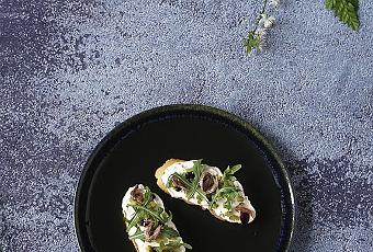 Tostar el pan en la tostadora. Triturar el queso junto con 4 anchoas. Untar con esta crema el pan. Espolvorear el pepinillo troceado pequeño. Agregar unas hojas de rúcula y unas gotitas de reducción de vinagre balsámico.