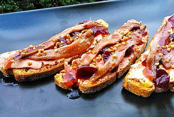 &version; Empresa Conservera"Serrats"Desde 1890En 1890, José Serrats se establece industrialmente en Bermeo, con el deseo de conservar y llevar a los lugares más alejados, la deliciosa frescura y sabor de los productos del mar Cantábrico. Ayudado por la excepcional calidad del pescado, implanta las nuevas técnicas de conservación provenientes de Francia, que le permiten introducir rápidamente sus elaborados en los mercados europeos.A partir de 1914, en "Hijos de José Serrats, S.A.", se empieza a exportar también al mercado norteamericano.Para 2 personasIngredientes:- 1 lata de anchoas del Cantabrico- 4 rebanadas de pan tostado - pate de pato - mermelada de arándanosElaboración:Cortamos unas rebanadas de pan de chapata y las pintamos con aceite de oliva, las ponemos a tostar en el horno hasta que se doren, retiramos y dejamos enfriar.Ahora montamos el plato, primero untamos las rebanadas de pan con pate de pato, o mouse de pato lo que más nos apetezca, ponemos unas cucharadas de mermelada de arándanos y por ultimo un par de anchoas encima, ya tenemos preparada una rica y buenísima tapa elaboradas con unas estupendas anchoas.Es una tapa con una mezcla de sabores intensos pero que están buenísimas y que a todo el mundo les encantara, os recomiendo estas anchoas son impresionantes tanto en sabor y calidad.Receta elaborada con el menaje de hostelería y cocina de la fábrica Supreminox en Vilassar de Mar (Barcelona).