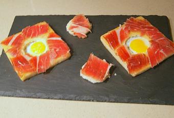 Hoy traigo otra tapa, muy fácil de hacer y que tiene una presencia muy apetecible, unas tostadas con huevo de codorniz integrado; además con salmorejo y jamón de bellota.