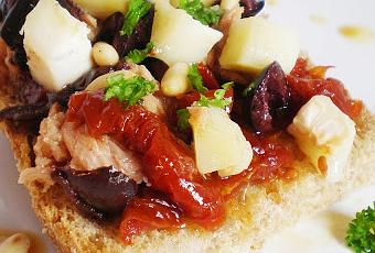 Tostar el pan y restregar el diente de ajo por su superficie, colocar encima el atún, tomate y aceitunas que teníamos en aceite.