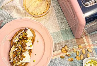 Le ponemos AOVE al gusto, untamos el hummus, colocamos el queso, distribuimos los níscalos y espolvoreamos con unos pistachos picados. Y lista para comer.